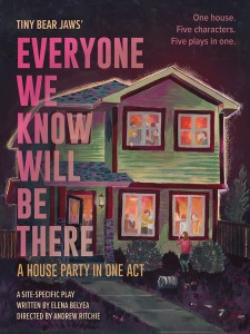 In Everyone We Know Will Be There: A House Party In One Act, the new site-specific play created by Elena Belyea for her company Tiny Bear Jaws, we’ll be partying in a house (and back yard) in Westridge. An audience of 25 max, we’ll be divided up into five “pods,” each assigned to follow one of the five central characters through the house. And we’ll be meeting up with an ensemble of eight other party guests from time to time.
