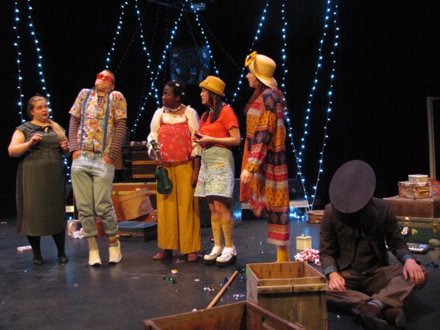 Last year Hicks’s play Wolves premiered on the Nextfest mainstage. In January 2016 she was working on another show — “75 pages of a play I hated, to meet a deadline” — when Garnish upstaged it in a three-day outburst of creativity. “I started with a bunch of boxes onstage,” Hick says, along with the thought that “whatever prop I need can come out of a box — an umbrella, a microwave, a functional poster. Ah, or a character….”