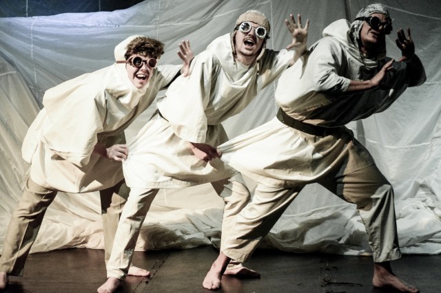 In the hands of London’s Dead Rabbits Theatre, massive balloons and blowing gales and polar bears are creative opportunities. As they demonstrated with The Dragon, a hit at last year’s Fringe, they are masters of stagecraft. With white sheets, a few ladders, small appliances, and dollies anything is possible.