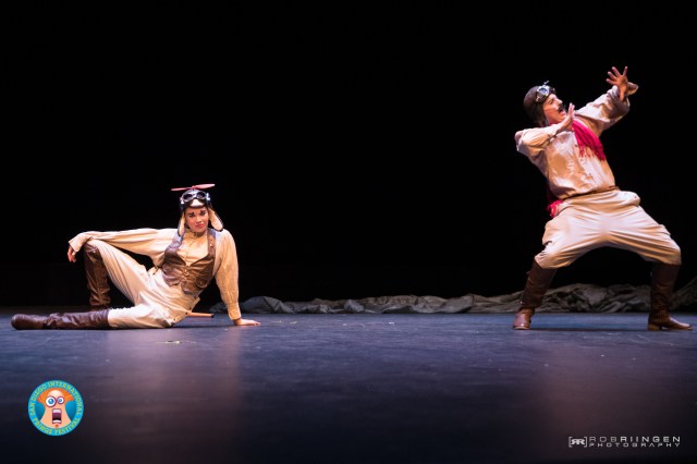 An airplane crashes on the stage. Beau (David Cantor) helps his co-pilot Aero (Amica Hunter) to her feet and they do what any incompetent aviators would do. They play with balloons and soda crackers, they battle and contort themselves, they dance, they flirt, they throw silent tantrums.