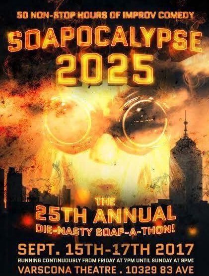 The 25th annual edition of Edmonton’s venerable improv comedy tradition, the Die-Nasty Soap-A-Thon, is at hand. Starting this very evening, 7 p.m. at the Varscona Theatre, the forces of the improv elite — the bold, adrenalized, strangely fearless horde who make it all up as they go along — are sudsing up for a weekend expedition, 50 straight hours long, into a dark improvised future: Soapocalypse 2025.