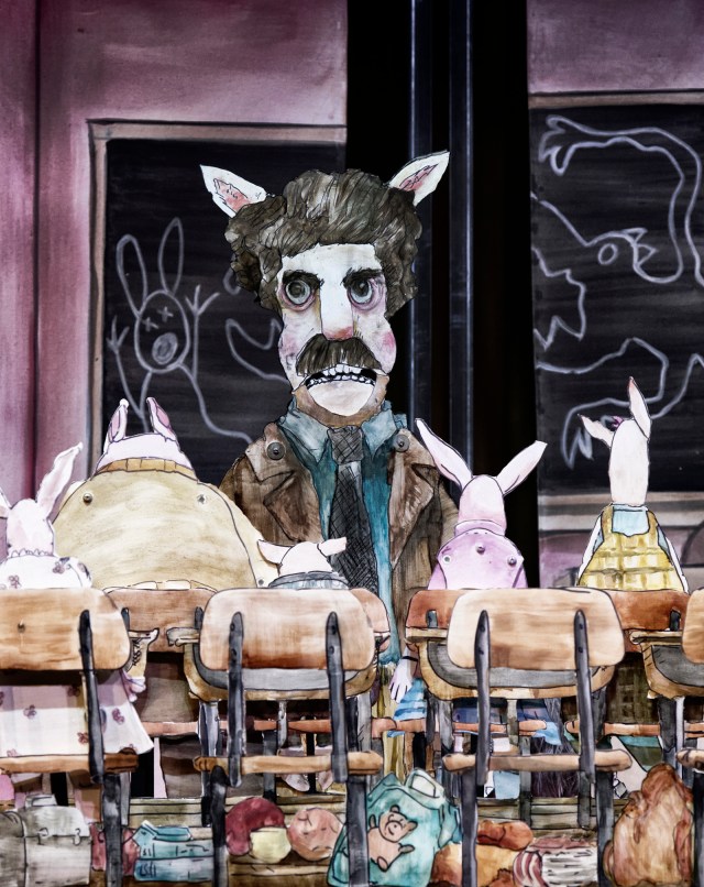 The puppets include life-sized rabbits (which is to say humans with exquisitely sculpted rabbit heads atop their own). There are small rod puppets characters set in motion in captivating ways by humans in full view. There are 2-D cut-outs of every size and shape, strange fantastical creatures, giant morphing frogs, fish and unidentifiable serpents, propelled by humans to vanish behind the screens. Phantasmagorical clusters of antique soldiers charge by, or knights, or monster school teachers from our hero’s past. There are memorable visions of urban life as nightmare, populated by grotesque party animals or oppressed by mindless routine. There are visions of the past.