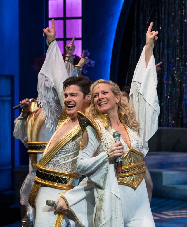 Corcoran’s ingenious stagecraft on the thrust stage that we surround — it is, after all, an island — includes consistently amusing use of a bed that rolls into the scene like the prop, metaphor, and bandstand it is. You’ll be captivated by the scene in which Donna’s erstwhile band-mates reach into the tickle trunk of their old costumes, which they use as a shameless excuse for an impromptu version of Dancing Queen. They deliver and they have larky fun with memories of their former selves.