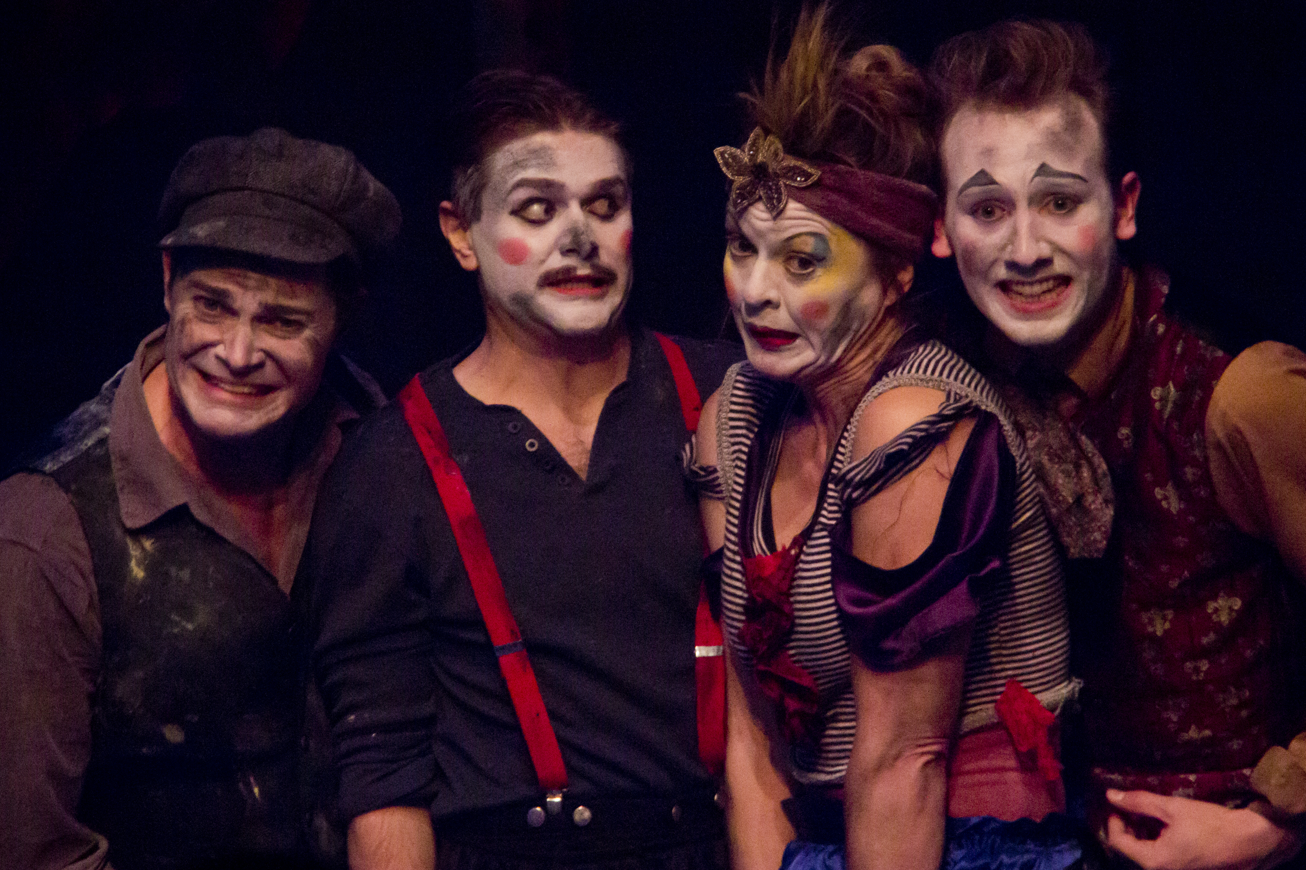 John Ullyatt, Vincent Forcier, Amber Lewis, Braydon Dowler-Coltman in Burning Bluebeard, Edmonton Actors Theatre. Photo by Nanc Price.