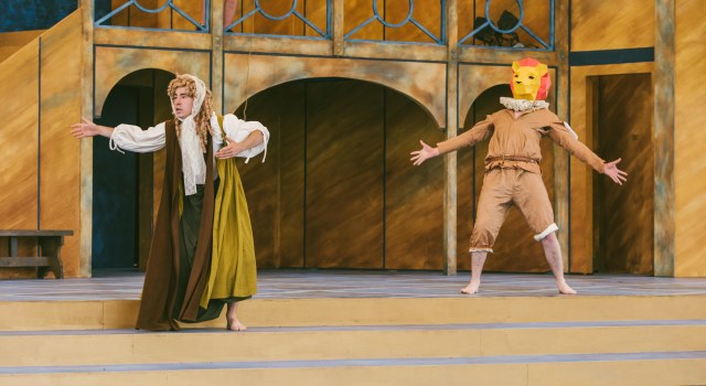 Stevens “started pulling lines and phrases” from A Midsummer Night’s Dream, and created an arc. Instead of Bottom, the perennial scene-stealer who “talks the most and gets lots of laughs,” as director Neil Kuefler puts it, But Hark, A Voice! highlights Flute. He’s the shy bellows-mender who gets assigned the girl part, Thisbe, and isn’t thrilled about it.