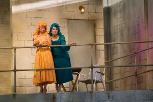 The former, apparently on a short fuse anyway (which may be why her lips are teal), gets steamed to boiling point by the increasing confusion. She gives great tooth-gritting tantrum. The latter is trying to be a loyal sibling support group of one, but she’s compromised by her attraction to one of the Antipholi. Amber Borotsik has choreographed an amusingly tentative tango for them.