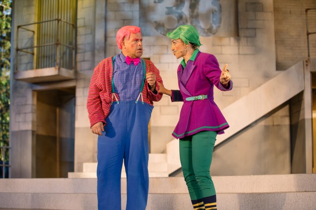 It’s a physicality intensified by the neon-hued costumes and complementary wigs devised by designer Megan Koshka, and fun to look at. Out of the corner of your eye, you might catch sight of two sisters, Adriana (Vanessa Sabourin) and Luciana (Gianna Vacirca), one in hair-to-toe teal and one in acid orange, strolling behind the stage, arm and arm, cartoon characters in a real-live park. Now, that’s the kind of layering that’s pure Comedy of Errors.