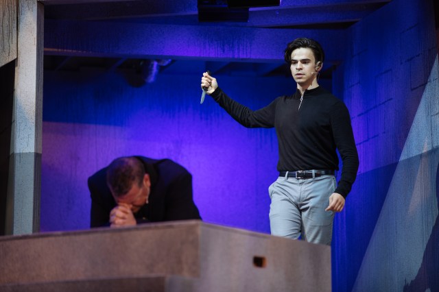 Ah, hypocrisy and treachery: they’re everywhere in Elsinore. As designed by Jim Guedo, and useful for the multi-door farce that is The Comedy of Errors (on alternate nights), Elsinor has a chilly monumental aspect, a court maze of plotters and spies. Ashley Wright turns in a fine performance as Claudius, the capable, professionally cordial, ruthlessly decisive usurper who’s murdered the old king. He has never expected to feel the pangs of conscience, you glean, and it’s unsettled him to the core.