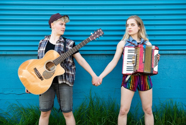 As Gaby, the charismatic Vickruck plays guitar and sings, and uses loop pedals and the mic in amusingly inventive ways (her sly Tinder cellphone sound effect song is a hoot). West’s Nina, kitted out in a nerdy denim skirt and fanny pack, trots across the stage to deliver her poems — like “Is My Love Doomed?” complete with histrionic gestures.