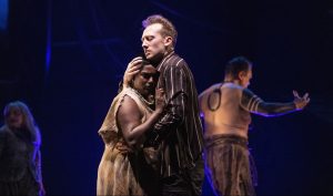 Not only is there less of the poetry of The Tempest, there are interpolations from other Shakespeare plays that land nimbly on their feet in the production. You’ll hear fragments of Romeo and Juliet in the charming budding-romance scene between Ferdinand (Dowler-Coltman) and Miranda (Kanagasekarampillai), for example, where their struggle for communication —he hears and speaks; she is deaf and signs — is lyrically invoked as part of the storytelling. They write in the water on the stage; they find common ground in the ASL and English signs for “heart.”