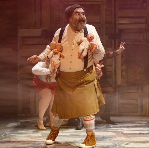 In the chaos of misplaced entrances, wrongly timed props and near-misses, and the tangle of prompts and improvised lines and insertions from the wrong play, a story with a high mortality rate, especially for kids, emerges (thank you sweet swan of Avon). The expendable younger generation is represented onstage by a battalion of small cheap plastic dolls who meet grisly ends. You know that the gore quotient is hitting red alert when the front rows surrounding the stage in Moss’s production are equipped with a splatter shield and bibs. Ooo, I do love a play with a good splatter shield (a lot of ketchup gives up the ghost in this show, just saying).