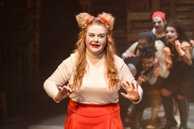 Marguerite Lawler plays Leap as a kind of toxic kewpie, a sex worker with tattered romantic dreams who plays Titus’s daughter Lavinia. She has a horrifying time of it in Shakespeare: shef gets raped, then has her hands cut off and her tongue cut out so she can’t accuse her attackers, Tamora’s sons Donny and Kevin.