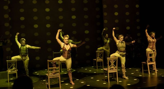 Jacqueline (Melanie Piatocha) is a crack sniper, who gets a lovely nostalgic number, a bit Vera Lynn, about England (the English rose) and France (the French lily). Anna (Marie Mahabal), a south Asian, is an expert code-breaker — with an operatic voice that shines in a passionate number about the price tag on human sacrifice. The Polish-born Charlie (Justine Westby) is on damage control. There’s a Senegalese-Parisian courtesan-turned-chanteuse Maddie (Tara Jackson, whom we last saw knocking it out of the park as Celie in The Color Purple), who specializes in insinuating herself into male environments. She gets a fetchingly playful and sexy jazz number. And Amanda Trapp is Betty, a Canadian Cree with a knack for explosives, who knows something, as she says, about living under occupying forces.