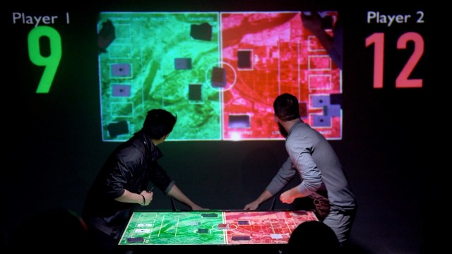 There are four kinds of cards that the players (who sit at tables made of flat-screen TVs, how cool is that?) use, in order: Companies, Grants, Projects, and Strategies. When you play a Company, it allows you to roll for Grants, which allow you to play Projects — and then Strategies to up the values of your Projects (and compete with your opponents’ Projects) to win over Communities. The player who ends up with the most Communities, wins.