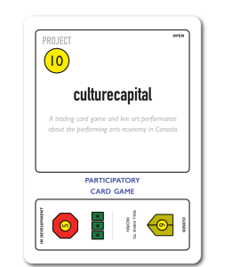 Which real Alberta companies will get an upward boost, or get buffeted by setbacks? Which strategies work in the current climate and which don’t? Which projects get public funding and get to be made, and which don’t? Touring, co-productions, risky ventures that pay off, or don’t … all are up for grabs in culturecapital. Your ticket to the action is a 72-card $21 deck.