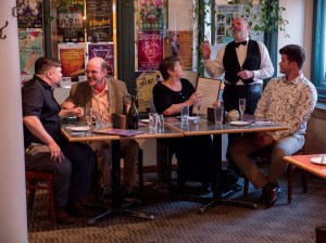 Gerald Osborn (centre) with Fringe directors past and present (from left) Thomas Scott, Murray Utas, Adam Mitchell, Miki Stricker-Talbot, Judy Lawrence, David Cheoros. Photo by Aaron Talbot.