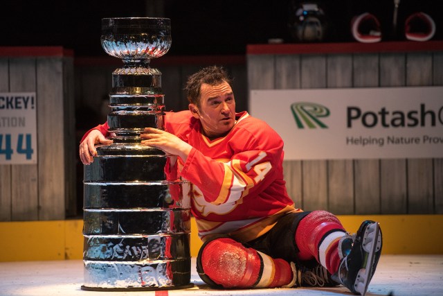 With the production that reopened the Mayfield Dinner theatre for real-live audiences this week (for a six-week run), hockey doesn’t just pirouette around theatre. No, there’s a bone-rattling full bodycheck into the boards.
