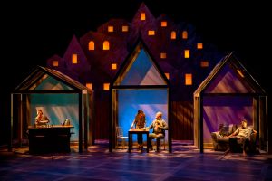 Narda McCarroll’s lovely design, glowingly lighted, conjures a neighbourhood from its moving parts: three open-sided peaked frames and three interchangeable interiors, set against a city skyline of stylized lights and towers. And on this set, Rachel Peake’s production sets the characters in perpetual motion, in and out of each other’s places, waving bottles, coffees, or grievances. Or pieces of paper with an enigmatic message: Let’s Fix It. The “it” will have something to do with the house, now abandoned, in which the fateful gunshot occurred four months earlier.