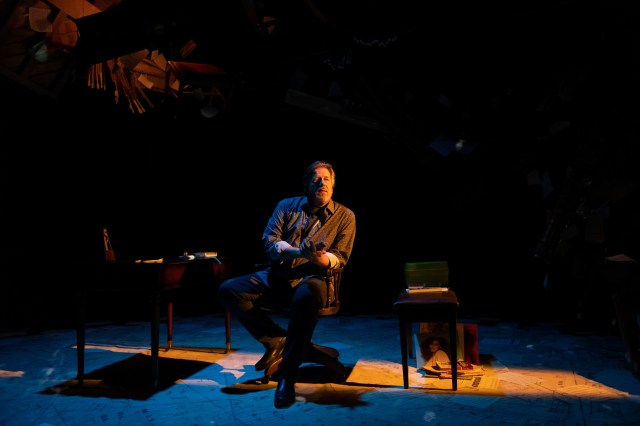 Instead, there are musical memories assembled from the air by Jason Kodie’s score, a vivid capture of time and place. For Hagen, memory is built and archived from music. And the circular floor on which Hagen revolves to tell his story is dappled with pages of music, notes, the ticking of the metronome. Adam Turnbull’s lighting and Ian Jackson’s video design, both striking, create a sort of magical memory world for Hagen to play in.