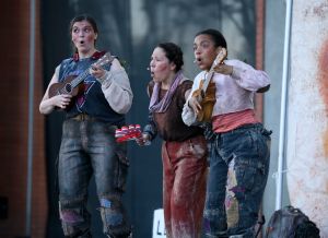 Macbeth: How often do you get to say you laughed out loud at a production of the Scottish play? Freewill Shakespeare Festival’s riotous three-actor production, directed by Dave Horak at the Fringe and other locales, made of Macbeth a black comedy with contemporary insights into the cycle of corruptibility built into leadership (its acquisition and maintenance), and our fatal drift to follower-ship. Perfect for these parlous times in our part of the world. An excellent cast of three — Laura Raboud, Nadien Chu and Rochelle Laplante — played the characters, the bouffons who deliver the stage directions, and the Unknowns who are versions of the Witches. Read the 12thnight review here.