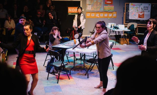 But “I have a very large nostalgia for big musicals. At the other end of the spectrum from Metronome, and its evocation of memory and sound, was Hackborn’s ultra-realistic design for E Day, her first professional production out of university. Jason Chinn’s political comedy, which premiered in the fall of 2019 in Theatre Network’s Performance Series, took us behind the scenes of the 2015 provincial election that swept the NDP into office. And Hackborn created a grassroots pop-up constituency office in an anonymous strip mall, the clutter detailed in every way — from cheap coffee maker, jars of pencils, post-it notes, fold-up tables, down to the hand-lettered sign ‘Make Sure Coffee Pot Is Turned Off At The End Of The Day’.