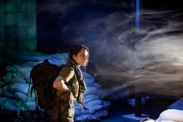 Between assignments when she returns to the civilian world, Alina doesn’t recognize her former life. It’s an aggressive chaos of grotesque noise, people drinking and talking about nothing in clubs, a disconnection conjured by the production. “I pass people just living, smoking, laughing, kissing. And they look through me like I don’t exist.” She’s furious one moment, and struck by the strangeness of tiny things — a cat, the sight of two old men in caps — the next.