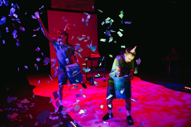 In the conception of Gilchrist, a queer trans writer/designer with a witty purchase on theatricality, we’re at a celebration of Self. There’s even a cake and party hats. Émanuel Dubbeldam and Geoffrey Simon Brown are a trans man and his idealized cis alter-ego, an endearingly nerdy study in physical contrast (the one compact, the other tall and leggy). They speak in unison, a jaunty two-person chorus of upbeat affirmative solidarity — until their voices separate under the pressure of perfectibility.