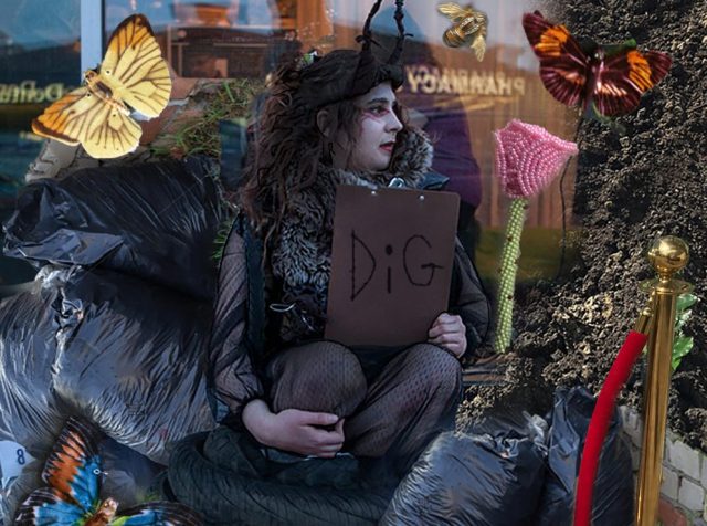 For the first two days of the festival, Dig asks viewers to contribute used objects, broken knick-knacks, “clean no-longer-usable things,” to be buried in the dirt. Saturday afternoon, “they will emerge from the dirt,” to be “activated” in a largely improvised performance by Barrington as she explores consumerism and its ecological impact, and the climate crisis … through trash.