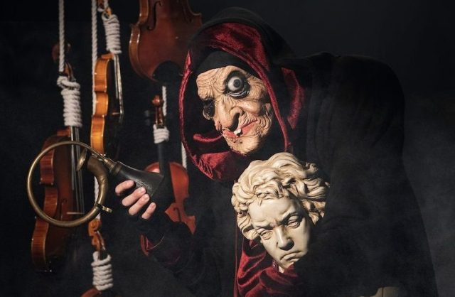 Directed by Davina Stewart originally for the Northern Light Theatre season just past (a COVID cancellation), the piece unspools in 11 variations, with minor adjustments. The grotesquely masked Quasimodo (actor Dave Clarke, ironically a sound designer himself) presides over a table of assorted noise-makers — rolls of cellotape, a melodica, a bell, finger harp, coconut shells … — and sounds them at random intervals.