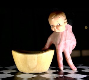 In the course of it, both live and magnified onscreen, in cunningly angled cameras and mirror images, we see Ingrid Hansen, presiding from a table of simple found objects, create characters from her own hands, fingers, tongue, and (as in the case of razzmatazz stand-up comic Lenny the Boob) other body parts. And she sets them in motion in a saucy and jostling vaudeville of ‘stars’ who are related under the skin, very literally.
