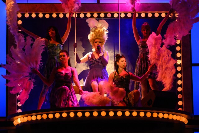 Vegas club owner Bobby (Nick Scheculski) enters at the start, in fishnets and full Frankenfurter mode, “just a sweet transvestite from Transexual, Transylvania.” And he sets the tone with a worldly shrug: acceptance, welcome to all, come as you are, “embrace your inner monologue,” “send your gender on a bender.” The theme song, so to speak, reprised in Act II, is Lady Gaga’s “I’m on the right track baby, I was born this way,” and Pamela Gordon nails it.