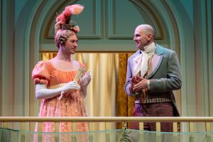 Director Mieko Ouchi and a dexterous cast of eight make a frantic screwball comedy of it. And I have to admit to some doubts going in, since making a farce from what is already a sparkling comedy is a tricky business. But in the process, Ouchi’s smart production has its cake and eats it too: a very modern sense of unravelling romantic comedy chaos, heartbreak and triumph … that comes with all the Georgian trimmings, so there’s fun to be had in the juxtaposition. There’s a classically symmetrical two-tiered two-staircase set (by Scott Reid), lighted in ice cream colours by Kevin Humphrey, and a cast dressed to kill in Deanna Finnman’s lavish, imaginatively tweaked Regency gear. No obvious jukebox jokes here: there’s a spinet (a pianoforte?) and period music.