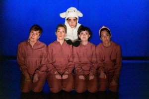 The chorus of four — Elena Porter, Sophie May Healey, Coralie Cairns, Noori Gill — in pink-hued workers’ jumpsuits (designer: Leona Brausen) deliver boldly comic performances, in a variety of permutations and incarnations, human and animal. They’re inventive (and Gill makes an outstanding Virginia Woolf), but I do wonder, though, if Dawkins’ production doesn’t occasionally force its comedic hand in theatrical playfulness, and delivery that’s sometimes leans into comical delivery, miming props, or synchronized choral movement at the expense of deadpan.