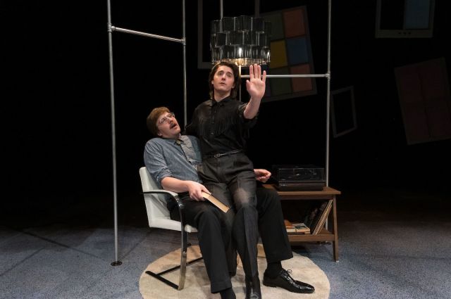 That idea has found its way into the structure of 10 Funerals, which follows a gay couple returning from a funeral in each of the play’s 10 scenes, “moving forward three years at a time from when they were in their 20s.” They’re played by Doug Mertz and Nathan Cuckow as the older couple version, Jake Tkaczyk and Josh Travnik, in a succession of wigs (costume designer: Leona Brausen), as the younger.