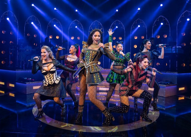 The creative team, led by co-directors Moss and Jamie Armitage, remains in place of course. Six is great fun to look at, and listen to. The visuals that play on Emma Bailey’s set with its light-up Tudor arches and rock show proscenium are a knockout. The production looks and sounds like the splashy high-end arena rock concert that’s also its premise. Gabriella Spade’s sparkly costumes have witty Tudor top notes (fishnets meet ruffs). Tim Deiling’s razzle-dazzle rock concert lighting, a barrage of flashing lights, cross-beams, a blinding proscenium, is matched by Carrie-Anne Ingrouille’s rock star choreography.