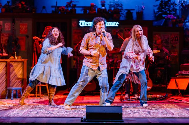 In Laurel Canyon, and the Troubadour (the L.A. club where everyone showed up and performed) the show has a blue-chip entry card into a remarkable collection of hit songs from The Mamas and Papas, The Byrds, The Lovin’ Spoonful, Buffalo Springfield, The Doors, the Turtles, then Joni Mitchell, Crosby Stills and Nash, Neil Young, James Taylor, Carly Simon. Even the Beach Boys; a visitation by Brian Wilson occasions Good Vibrations, in all its orchestral and choral complications, beautifully delivered by the cast.
