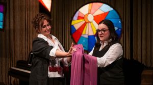 Bobby (Colleen Tillotson), who has a church bent, and Darla (Michelle Diaz), who decisively doesn’t, are temporary roommates: they’re in rehab. The former, struggling with an eating disorder, just loves to sing; the latter, who’s hostile and sardonic in Diaz’s amusing performance, is in tow for drugs, and needs something to do. Natalie (Jenny McKillop), who has seven kids and is a professional babysitter of unshakeable cheeriness, is there to have a world outside child-minding. She arrives invariably late, apologetic, and breathless, pushing a pram. May (Kirstin Piehl) is socially challenged, and she’s at choir to practice making connections and conversation. Her fallback in every moment of stress and hostility is to appeal to routine and organization.