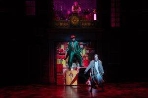 Kudos again to Cory Sincennes’ set, dominated by the fateful clock, and the revolving door at Marley’s through which characters arrive and leave. And Leigh Ann Vardy’s lighting has huge dramatic impact in this indelible ghost story. What continues to go amiss is a sound mix, on behalf of the band, that’s rather obtrusively loud and forward; it’s not always easy to make out the lyrics.