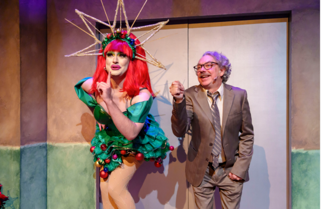 The characters are a study in contrasts, and in themselves a startling sight gag, as kitted out by designer Brianna Kolybaba (I defy you to see them together and not smile). Ted (Thomas Jones) is a sad-sack pipsqueak of an accountant, gray of mood and suit. Drag queen Natasha (Zachary Parsons-Lozinski, aka Lilith Fair) is a twinkling seven-foot tannenbaum, sparkling from head to toe, who has evidently taken the show title to heart. And she’s certainly got the donning of gay apparel down.