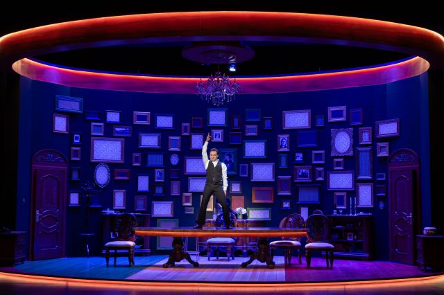 Sincennes’ set, backed by a wall of glowing multicoloured stained glass ‘windows’ and (real-life) Timoteo family photos, lands like a bright idea (lighting by Conor Moore and Celeste English) far back in the darkness of that stage. What you lose is the sense of raising a glass with Salvatore in his dining room. What you gain is a certain presentational pizzaz. After all, our joint protagonists are father and son, who share a coming-of-age story driven by the tensions built into the immigrant experience. And Salvatore’s teenage kid Francesco is a singer, an aspiring band leader who breaks out of the family expectations … by performing.