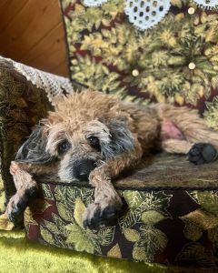 And back in his supervisory role as the company’s studio “Majordomo” (as credited in the program) is Robbie, the elderly canine member of the Burkett/Alcorn household. Mister, says Burkett, “isn’t physically based on Robbie, but absolutely on my relationship with him.”