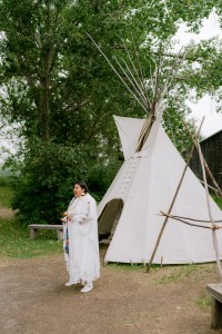 You can follow the Indigenous-led track of Nehiyaw huntress Ekah (Emily Berard), or you can follow Lily (Christina Nguyen), a Euro idealist recently arrived in the West and discovering for herself its complex realities. I picked the former track, and (not coincidentally) we were led just outside the Fort. We arrived at a teepee with a welcoming white-clad Indigenous figure Takah (Maria Buffalo). In a production clad in earth-tones, there she was, in dazzling white, with a white feather in her hair. Was she a benevolent ghost from the ancestral world present on behalf of the continuity principle? A stalwart angel? A dream spirit? I’m not too sure. But she shepherded us through a variety of locations, and watched us watching.