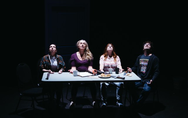 Rachel Bowron is grim Dave, the fiercest of the group, a veteran of “quadruple alien probing” (the mind boggles), on perpetual red alert armed to the teeth for the coming war. Jenny McKillop is the daffy, conciliatory, and extremely pregnant Laurel. Particularly amusing is Oscar Derkx as Wayne, the ex-child star and full-time narcissist who constantly quotes the now-defunct TV series Junior Law. (“so help me law” is his favourite oath). He’s particularly infatuated with his own psychic abilities. There’s a very funny glibness about Ross, the leader of the group, in Braydon Dowler Coltman’s performance. And, as catalyzed by the newcomer’s reported experience, they slide into overlapping conversation, and the absurdist reaches of argument, with escalating speed under Tellier’s direction.