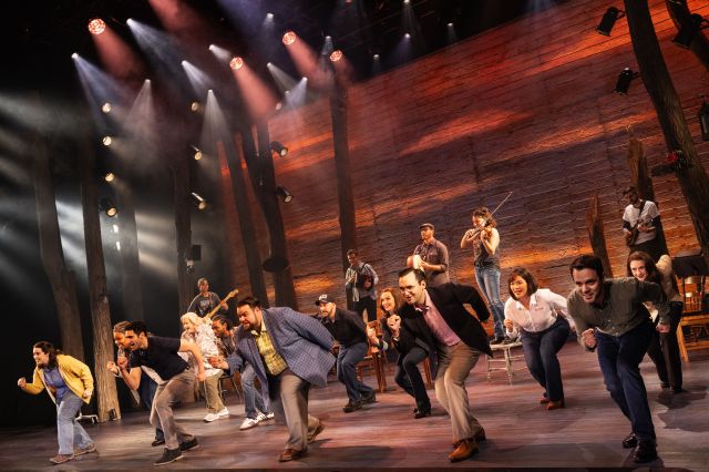 Instead of spectacle, Come From Away has ingeniously stylized low-tech stagecraft. The Beowulf Boritt design is framed by a stand of bare tree trunks, and a back wall of wood, which turns out to be slatted when slivers of light glint through. And the set consists largely of mismatched chairs rearranged to suggest plane interior, a school bus, the Legion, the local Tim Horton’s. In defiance of the standard Broadway playbook, there’s no real star, except a whole community; there’s no real villain except for the state of the world. And it’s about people being, well, nice.