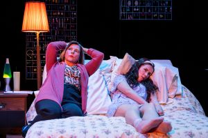 The actors are up for it, even if the characters (deliberately?) don’t mesh. Bea, in Unruh’s performance, is devoted to non-stop physical motion, presumably to demonstrate the self the character has lost. The lighting by Whittyn Jason does assist in differentiating past and present, imaginary and real, Bea. But for much of the play, Bea, flirtatious and girlish, flings herself in and out of bed so continually you might be forgiven for wondering at any moment if she’s remembering her young self or being her bedridden current self on an improbably good day. In either case, this does wear thin, perhaps because the physical limitations of the character in her current state, eight years’ worth, aren’t defined very persuasively.