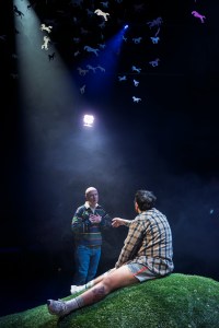 Horseplay’s feet, and hooves, are on the grass. Its heart, available for the breaking, is in the air. And, in Heather Inglis’s premiere production it happens under a stunning spiral of tiny flying horses (designer Beyata Hackborn), glowingly lighted by Sarah Karpyshin. As Horse, wonderfully played by Alexander Ariate, says from time to time, “to run is to fly.” That’s already an imaginative leap, beyond the actor perpetually in motion — and there will be more.