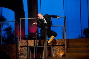 As the quick-witted servant Grumio in The Taming of the Shrew, O’Donnell has ridden pellmell toward the stage on a motorcycle behind Julien Arnold’s Petruchio — and crashed. “Julien went to turn, on the gravel in the parking lot, and we went down. We got up and waved to the stage manager we were alive. She ran over and said ‘if you’re OK, park it and go!’. The two of us staggered onto the stage and collapsed.” The audience roared.