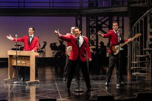 Jason Sakaki, Kale Penny, Farren Timoteo (front), Devon Brayne in Jersey Boys, Citadel Theatre. Photo by Nanc Price.