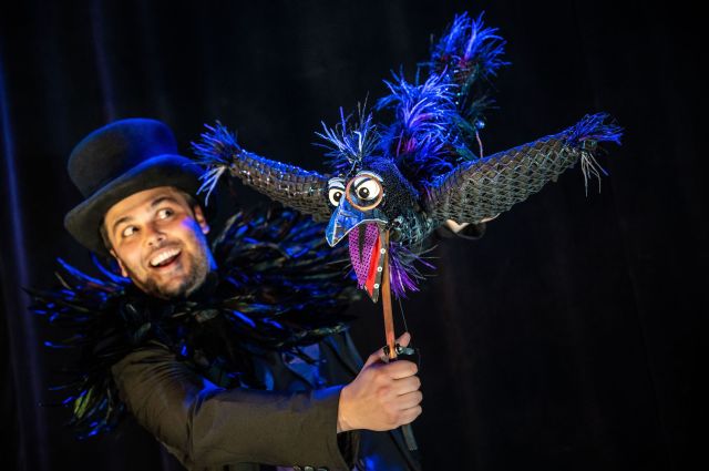 Adam Proulx and Horatio P. Corvus in The FAMILY CROW: A Murder Mystery, Edmonton Fringe 2023. Photo by Dahlia Katz.