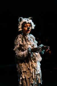 Our aspirational raccoon is looking for a transcendent experience (aren’t we all?). Which explains why they’re drawn to interact with the audience: “I have never seen so many human beans in one place before,” they say, cautiously approaching one of us. “You look nice. Are you nice?” And since existential questions are a veritable dumpster dive (or rabbit hole, to mix our species allusions), the curious raccoon wonders about destiny, identity, and whether we’re locked in, to either. Death: now there’s a question. Which brings them to God — who, what, where? “what is your real name?”.